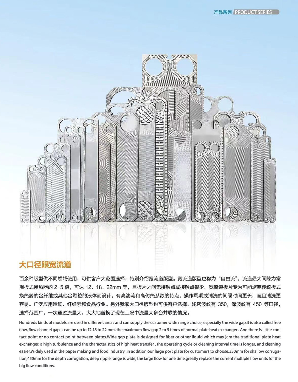 百余种版型供不同领域使用,可供客户大范围选择,特别介绍宽流道版型。宽流道版型也称为“自由流”,流道最大间隙为常规板式换热器的2-5倍,可达12、18、22mm等,且板片之间无接触点或接触点很少。宽流道板片专为可能堵塞传统板式换热器的含纤维或其他含颗粒的液体而设计,有高湍流和高传热系数的特点,操作周期或清洗的间隔时间更长,而且清洗更容易。广泛应用造纸、纤维素和食品行业。另外我家大口径版型也可供客户选择,浅密波纹有350,深波纹有450等口径,选择范围广,一次通过流量大,大大地替换了现在工况中流量大多台并联的情况。